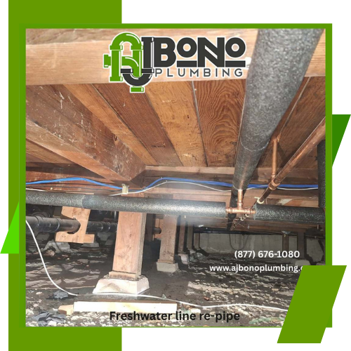 Tired of low water pressure? Call AJ Bono Plumbing, the re-pipe specialists. Our team can efficiently re-pipe your home, restoring reliable water flow and improving your plumbing system’s overall performance. Benefits of re-piping include consistent water pressure, reduced risk of leaks, and increased longevity of your pipes.